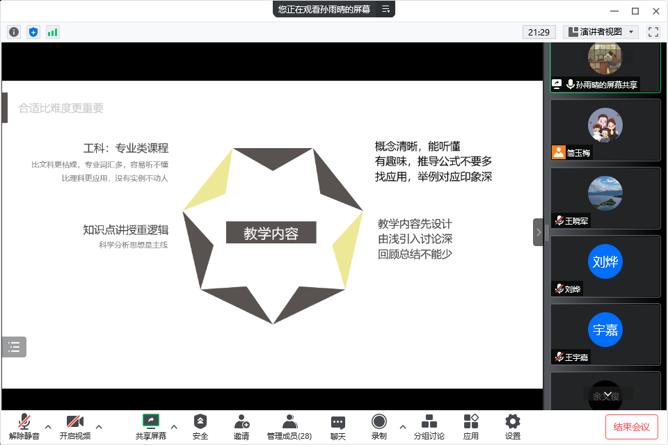 随后,孙雨晴老师结合自己参加教学比赛的经历,从教学内容设计,到PPT的制作,再到比赛现场衣装、教态、表达,以及如何和学生互动等方面,为大家分享了个人的一些心得和体会。