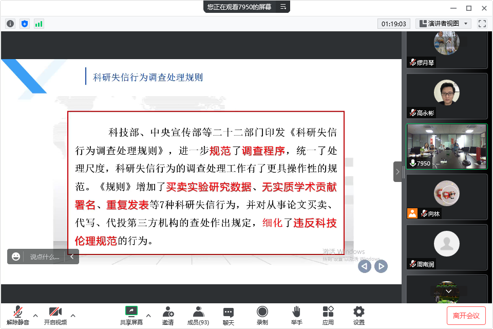 通过本次学习大力提升了大家对科研失信行为和细则等新修订内容的理解,对营造良好的科研氛围具有重要意义。