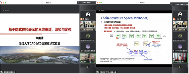 论坛中上海海事大学信息工程学院长周日贵教授以“量子图像处理技术”为主题作主旨报告,阐明了量子图像处理技术的研究背景及研究现状,并详细介绍了周日贵教授团队在量子图像处理算法中的工作及其仿真验证;厦门大学科技处处长,国家杰青纪荣嵘教授以“神经网络结构搜索”为主题作主旨报告,通过网络结构变迁的背景和当前研究领域面临的一些问题着手,提出解决方案和探索策略,搜索策略;浙江大学CAD&CG国家重点实验室教授,国家优青章国锋教授作题为“基于隐式神经表示的三维重建、渲染与定位”的主旨报告,报告介绍了神经隐式的背景、应用场景及其未来的挑战与现实中的应用。硕士研究生陈少涛、茹亚军就自己研究方向所获得的最新成果做交流分享。从选题背景、研究意义、国内外研究现状几方面入手,详细分析当前面临的问题和解决思路,并作未来展望。