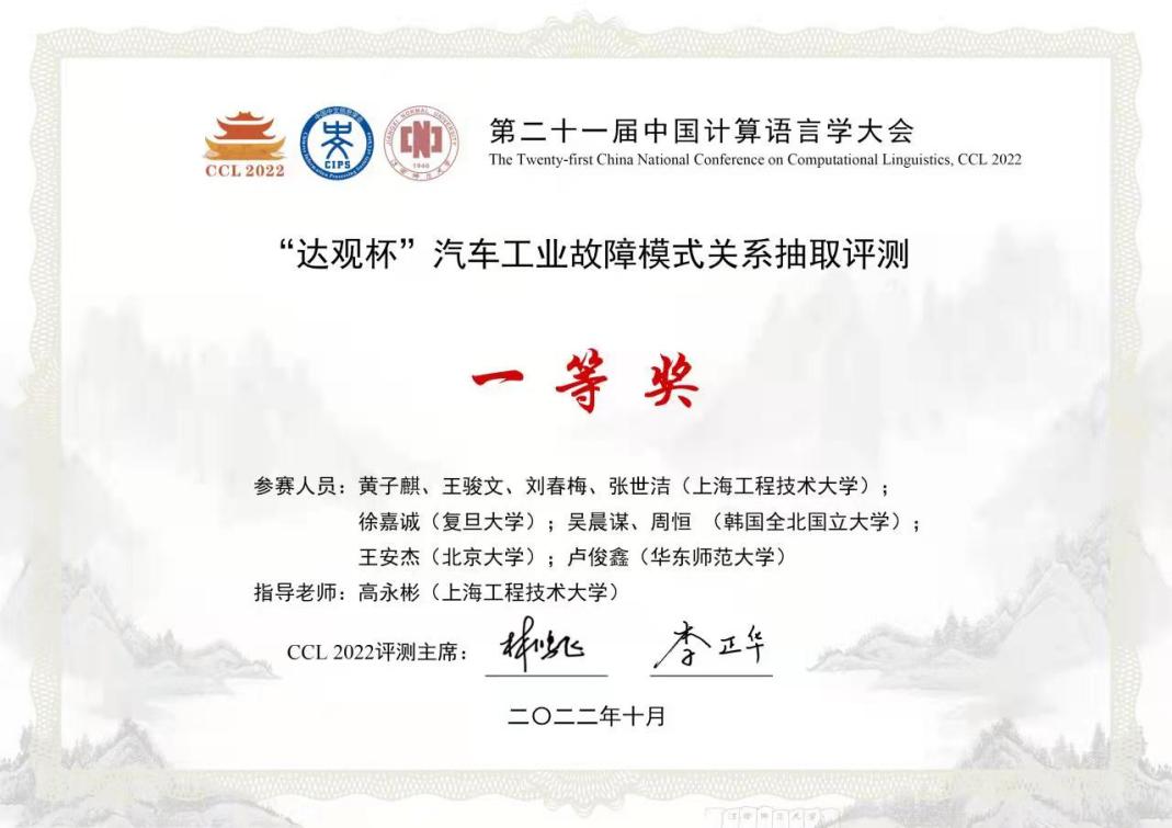 我院“工程大工业KE”队伍在2022年8月积极参与了CCL大会、达观数据和复旦大学共同组织的 “汽车工业故障模式关系抽取评测”的评测竞赛。本次评测任务包含信息抽取技术中的实体抽取和关系抽取两大任务,围绕汽车故障领域的案例文本,专家定义出了三类实体和两类关系,从故障案例文本自动抽取实体和关系,最终以抽取的准确率F1值为量化评测指标进行成绩排名。参赛队伍依托科技部科技创新2030“新一代人工智能”重大项目“工业领域知识自动构建与推理决策技术与应用”,在工业领域知识表示、知识抽取、知识融合与推理决策领域开展的相关研究基础上,制定出适用于此评测任务的解决方案并完成结果提交。最终,在我院高永彬老师带领的师生团队共同努力下,我院参赛队伍顺利取得CCL“达观杯”评测任务第一名的好成绩。