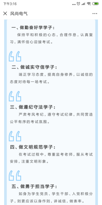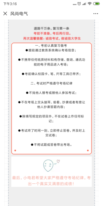 另外学院风尚电气微信平台也定期为同学们推送诚信考试、严肃考风考纪的相关内容,提醒同学们希望大家能在考试中充分发挥出自己的水平,顺利通过考试。