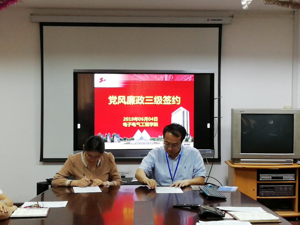 最后,院党委书记段海霞与党委副书记、支部书记,院长方志军与副院长、系主任分别签署了《2019电子电气工程学院党委党风廉政建设责任三级签约书》。