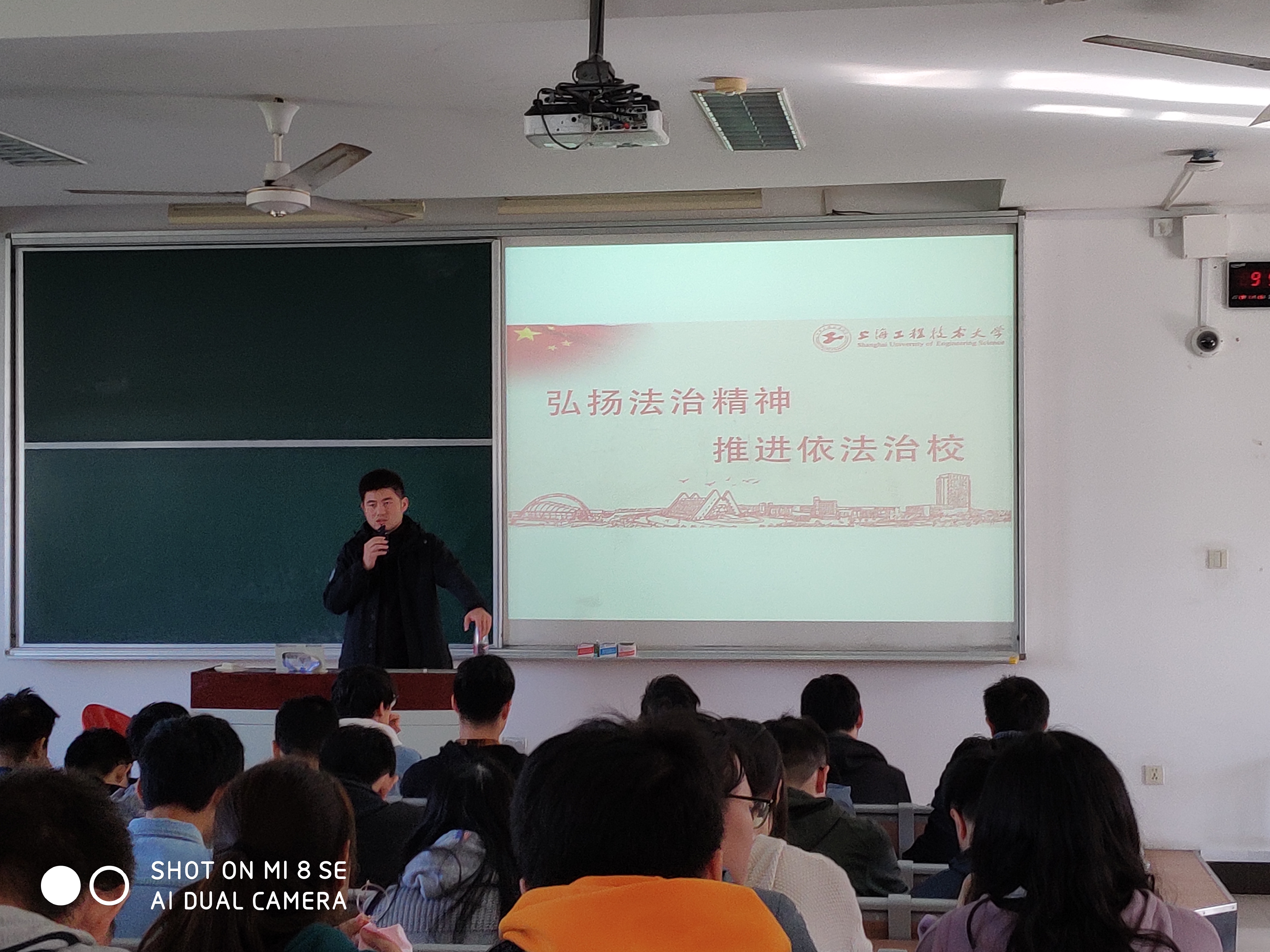 本次“依法治校示范校创建工作”专题学习,我院通过多种形式组织学生们进行了学习,深入宣传学习《教育部依法治教实施纲要(2016-2020年)》、《上海市教育法治建设“十三五”规划》、《上海工程技术大学章程》等内容,确保了本次学习深入学生头脑。(贺小倩)