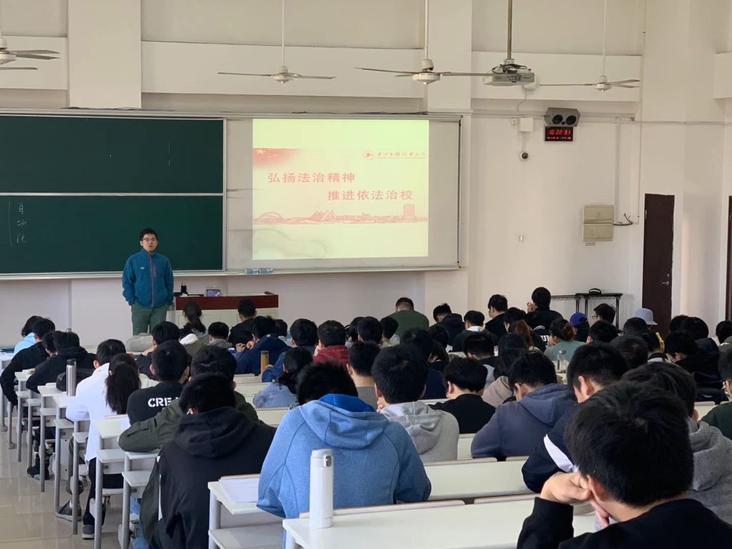 在本次“依法治校示范校创建工作”专题学习过程中,我院采取“点面结合”的方式,2017级辅导员高艳杰、贺小倩“点对点”面向全年级各个班委,组织班委一起集中学习,明确了本次学习的重点难点,再让班委组织自己所在班级进行学习,充分发挥“头雁效应”,既发挥了班委的带头作用,又最大程度的覆盖到全年级所有的学生。2019级辅导员李迎、江文超为了能促进学生的学习更加深入,选择“分头行动”,以系别为点,分别给各个系的同学们开展了相关讲座,为学生们解读了《教育部依法治教实施纲要(2016-2020 年)》、《上海工程技术大学章程》 ,讲座中与学生积极互动,邀请了学生代表进行发言,从而帮助大一新生们理解依法治校的要求、我校学校章程等内容。