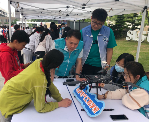 本次科普进校园活动是由松江区网信办、共青团上海市松江区委员会、松江区教育局主办的“全民数字素养与技能提升月”活动。党员志愿者通过丰富的科普内容、生动的演示和互动环节,展示了学院自主研发的无人机,向上外松外学子科普了无人机的原理、技术、功能、应用领域和未来趋势。在科普体验环节,党员科普志愿者指导上外松外学子操作遥控器控制无人机起飞、降落和悬停,通过孩子们的亲身体验,使上外松外学子感受到了无人机飞行的刺激与乐趣,激发了对无人机技术的兴趣。此次科普系列活动中,党员志愿者们还向孩子们介绍了自己动手设计制作的智能门锁,从电路原理、电子部件到控制器、传感器、马达、电源如何协同工作,从电容器、电阻器、二极管和晶体管到如何控制电流的流动和电压的变化,从而实现门锁的智能化控制和安全保障,通过系列活动,让孩子们对电子信息专业产生了浓厚的兴趣。