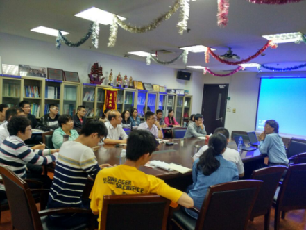在会议中,吴飞教授首先介绍了在无人机平台上的工作设想,着重讲解了以节能为导向,无人机在航拍、导航和图拼三个方面的应用研究内容和研究方案,并通过实际背景需求、现有技术的支持来说明其可行性。随后,黄正能教授对无人机的上述三个内容一一解释了可能遇到的技术难题及相应对策,给出了在航拍图传节能方面考虑压缩技术、导航无GPS时根据已知坐标来校正当前位置等研究点,引出了对于科学研究与实际应用之间的关系这一问题的思考,在场的老师及同学纷纷参与讨论。