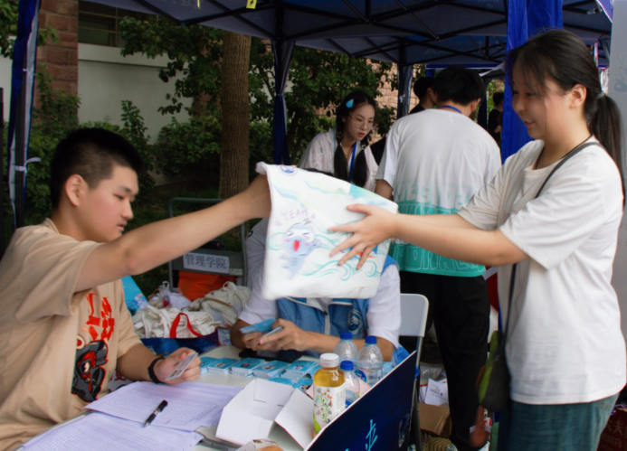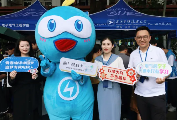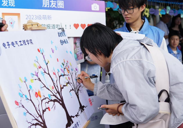 为了让学生更好的了解专业特色,学院在迎新点上融合了诸多电气学院的元素。全场最活泼的吉祥物“小电”是新生们拍照合影的首选。让新生在带有专业名称的意向牌上写下对未来四年学习的期许。并在现场体验互动“iclass”平台,将自己的祝福弹幕投屏,“青春电气、大树成林”23级的萌新在“电院树”摁下手印,留下属于自己的开学印记。“相知陪伴帆布袋”,“温暖常在校园卡套”、“开启未来钥匙扣”和“满心祝福明信片”满满的大礼包都是对新生满满的爱。