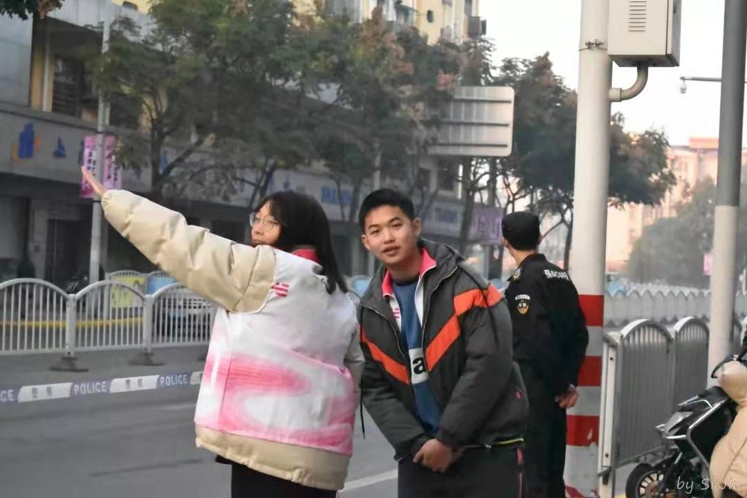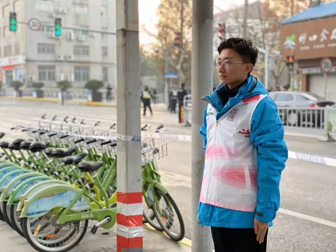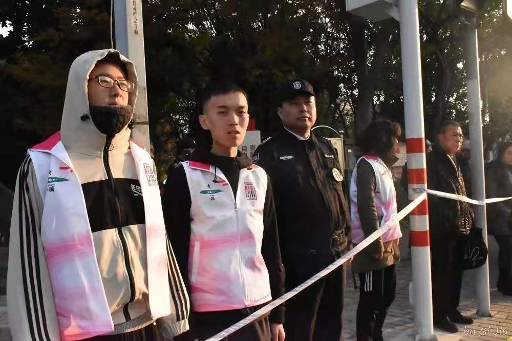 凌晨4:45,大巴已经等在了学校的西门。在这个大多数人都仍旧在睡梦中的时间,我院的80名学生已经整队坐上了巴士,前往他们进行志愿服务的地点——环城东路至海盈路口路段。清晨的寒意不禁让大家都裹紧了大衣,但当比赛开始,作为沿途的志愿者们,即使冻僵了手,也仍旧对志愿者的工作心怀热忱!跟随保安,民警和其他的民众志愿者,我们的同学认真站好每一个岗,做好协调劝阻的工作,维护了赛道安全和秩序。