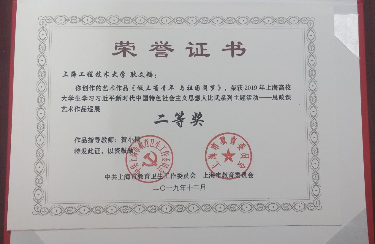 为深入贯彻落实习近平总书记在学校思想政治理论课教师座谈会上的重要讲话精神,隆重庆祝中华人民共和国成立70周年,2019年上海青年大学生马克思主义理论“学习”大比武颁奖仪式于2019年12月26日在上海戏剧学院新空间剧场举行。我院 2017级自动化一班耿文韬同学所创作的书法作品《做三有青年 与祖国同梦》荣获2019年上海高校大学生学习习近平新时代中国特色社会主义思想大比武系列主题活动——思政课艺术作品巡展二等奖。