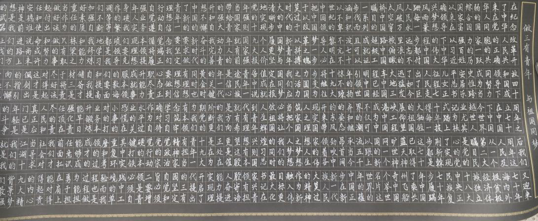 这幅作品讲述了自改革开放以来,中国在共产党的带领下从一个极贫弱的国家慢慢变成了当今世界第二大经济体,百姓们在党的领导下,安居乐业,尤其是在十八大以来,在习近平总书记的带领下,中华儿女正式踏上了实现中华民族伟大复兴的征程。回想七十年劈荆斩棘,中国发生了翻天覆地的变化,神舟飞船太空穿梭;三峡工程造福万民;中国桥、中国路、中国港、中国网;一个个世界瞩目的超级工程已经成为了中国的新名片。这些新中国的巅峰之作,实现了我们现在的中国梦,作为当代的青年人,我们要怀揣实现中国梦的伟大理想,努力成为十九大习近平总书记提出的“坚定信念,履行使命;积蓄力量,贡献力量;志存高远,脚踏实地”的“有信念、有本领、有担当”的三有青年。(贺小倩)