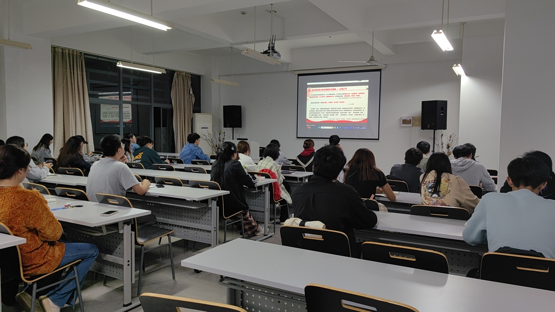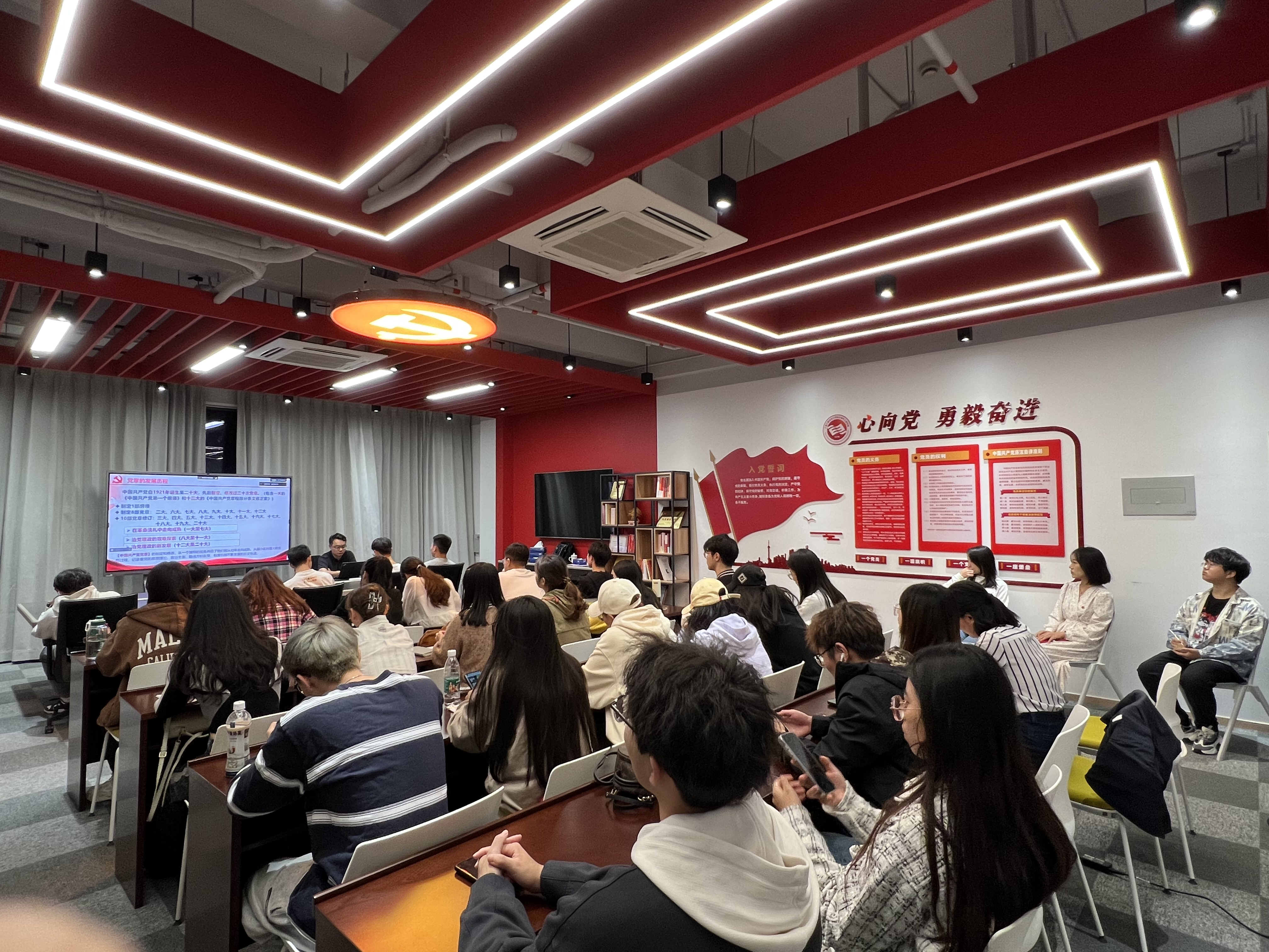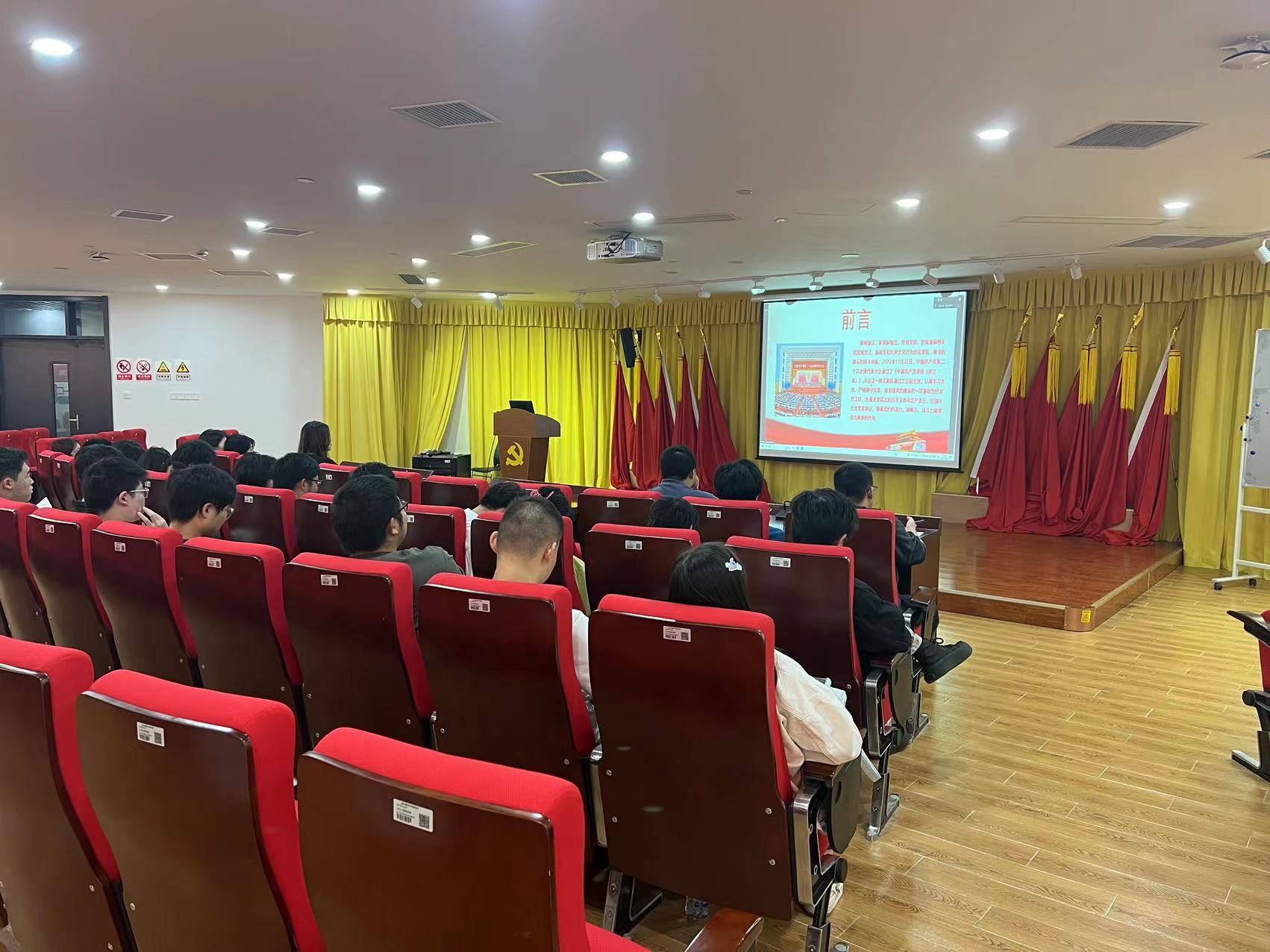 机械与汽车工程学院叶寅老师以“新《中国共产党章程》总纲解读”为题,以上海是中国共产党首部党章诞生地为切入点,从党章总纲概述、战略目标、基本路线、基本方针、基本要求、党的领导等方面详细阐述了总纲内容,并结合从“汽车大国”向“汽车强国”迈进、焦裕禄等事迹事例勉励同学们要坚定理想信念、严守党章规矩、知行作表率。