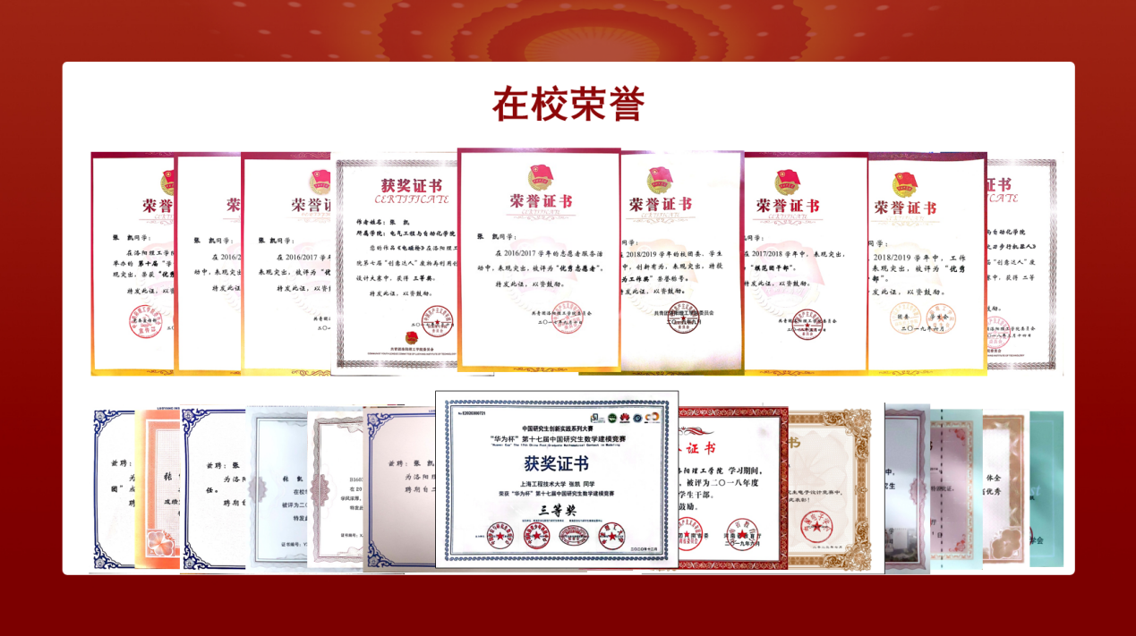 张凯,2018年加入中国共产党,曾多次主动报名参军,于研究生阶段成功服役上海武警。服役期间,先后获得“爱军习武好战士”“四有”优秀个人及两次个人嘉奖。复学在校期间获得研究生学业奖学金一等奖,数学建模国家三等奖等各类奖项36项。
