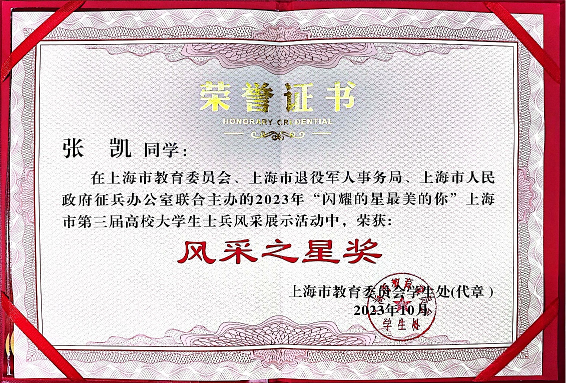 10月25日,由上海市教委、上海市征兵办和上海市退役军人事务局主办的“闪耀的星最美的你”上海市第三届退役大学生士兵风采展示颁奖典礼在东方绿舟举行,我院控制科学与工程专业20级研究生张凯荣获“风采之星”称号。