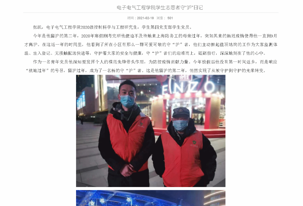 在生活中,张凯始终牢记全心全意为人民服务的宗旨,积极投身各类志愿活动,疫情期间,他在大上海疫情保卫战中,成为社区防疫的志愿者,上海平安年的守“沪”者、学校疫情防控的保卫者,以自己的实际行动展示新时代退伍青年大学的责任与担当。