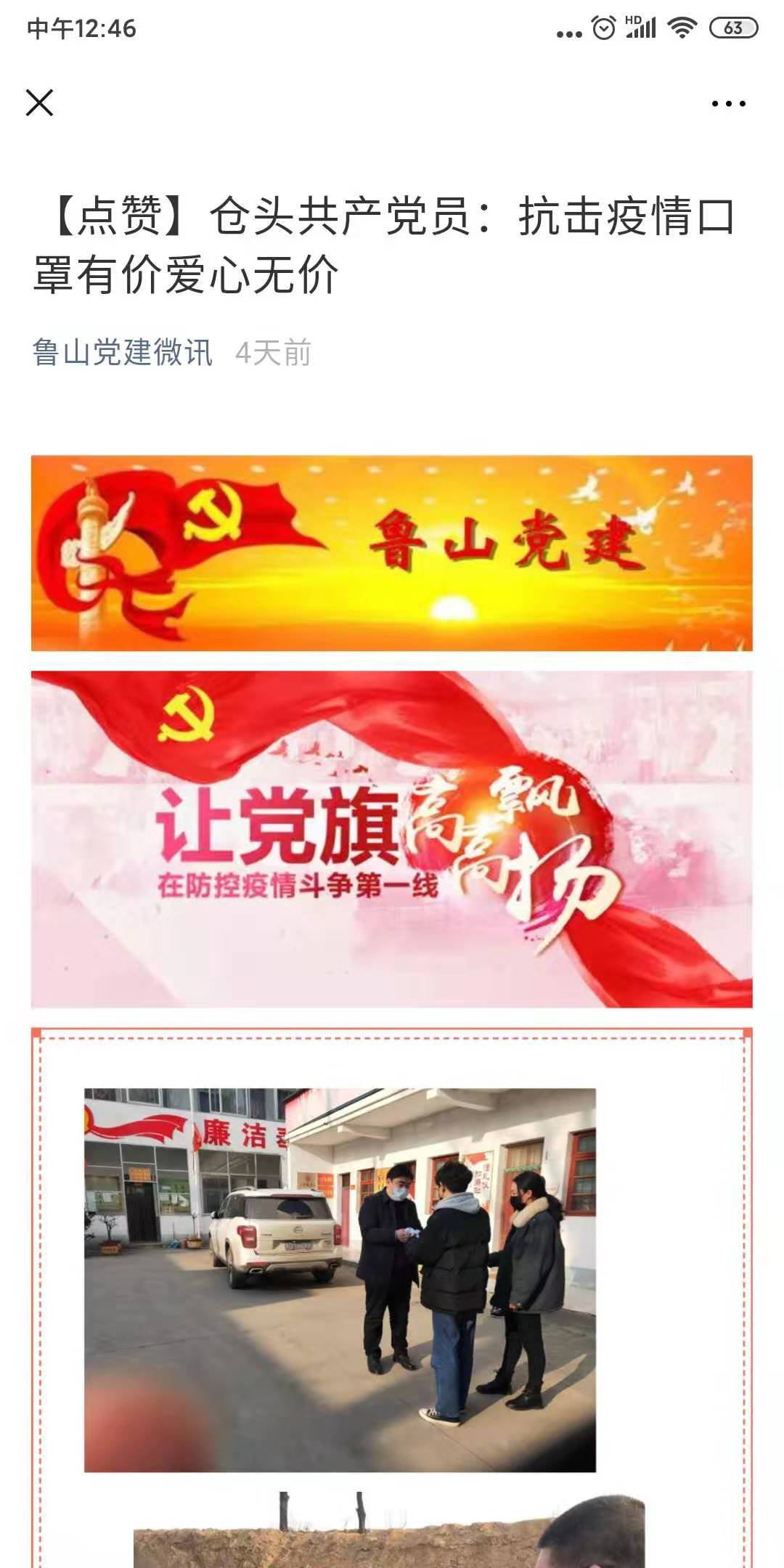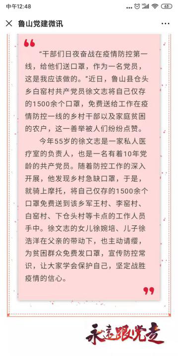 18级广播电视工程专业徐浩洋同学与家人一起免费为村民发放自家口罩1500个,事迹被当地媒体报道(鲁山党建微信)。