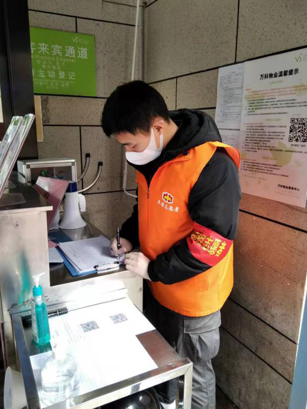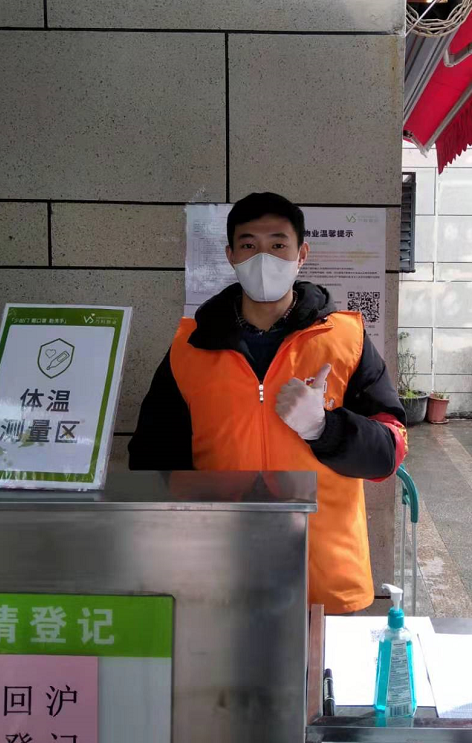 郭珅佑同学主动报名参加了松江区中山街道淡家浜居委会防疫志愿青年突击队,他深知目前社会对防疫志愿服务工作的迫切需求和作为一名预备役人员的职责和义务,他的主要工作是负责对返沪人员进行登记,维护待测体温人员秩序,防疫知识宣传、分发防疫物资等,有时候忙的顾不上吃饭。