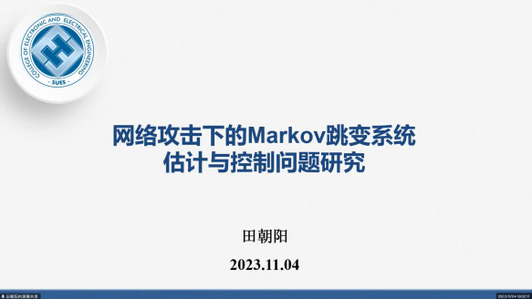田朝阳硕士首先分享了关于“网络攻击下的Markov跳变系统估计与控制问题研究”的研究成果。他详细讲解了在网络攻击环境下,如何应对Markov跳变系统的估计与控制问题,并展示了课题组在这一领域的研究取得的重要进展。