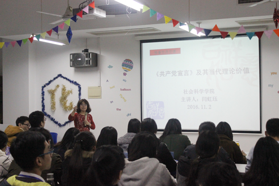 闫虹珏老师对《共产党宣言》的内容进行了分析,她详细介绍了《共产党宣言》的诞生背景,并对七篇序言和正文做了导读。同时她还特别强调指出了《共产党宣言》当代理论价值。她就“今天我们应该如何评价资本主义?”和“当代学者对资本主义的评价”这两个问题展开深刻剖析。她表示就资本主义而言,资本的本性(利益至上)促使资产阶级不断发展生产力,不断推动资本主义生产关系走向崩溃。随着资本积累的不断增长,生产的社会性与资本主义的私人占有形式之间的矛盾日益加剧,这是资本主义被新的、更能够适应社会化大生产要求的社会形态所取代的根本原因。