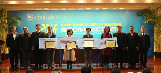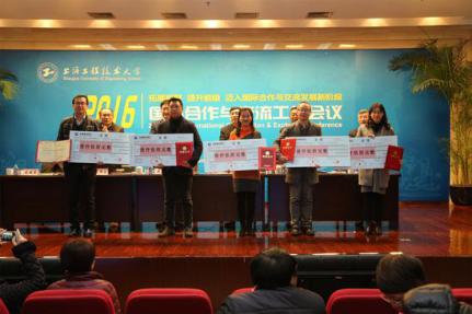 12月23日下午,在图文信息中心第二报告厅召开的学校2016年国际合作与交流工作会议上,我院获得今年全部五项国际合作与交流奖励,分别包括:留学生教育优秀奖、学生国际化教育优秀奖、国际科研合作优秀个人、高层次外籍专家引进优秀奖和国际合作与交流优秀学院。全体校领导为获奖的优秀学院及优秀个人颁发了荣誉证书,学院党委书记陆展华,院长方志军,副院长李媛媛分别上台领奖。