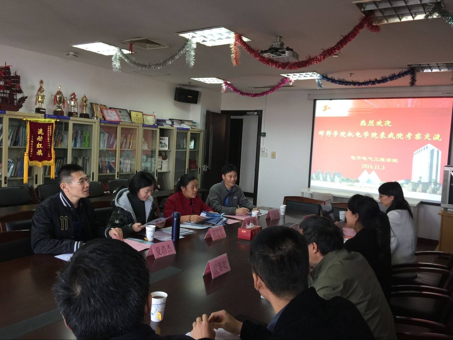 河北邯郸学院机电学院副院长王海飞、杨静老师就学院电气工程专业建设、学科建设、电气实验室建设等方面的措施进行了详细咨询。座谈会结束后,梁鉴如老师等带领邯郸学院机电学院一行参观了学院实验室。