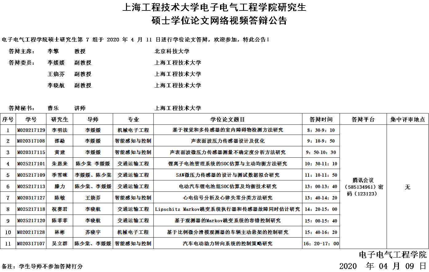 电子电气工程学院2020年4月11日第7组网络视频答辩公告