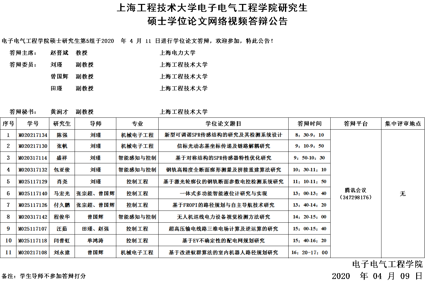 电子电气工程学院2020年4月11日第5组网络视频答辩公告